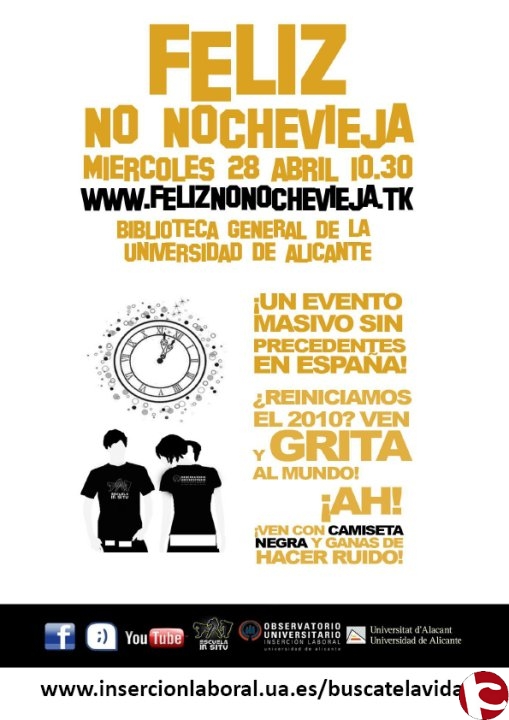 El Observatorio de Inserción Laboral, el grupo de Danza InSitu y los vicerrectorados de Relaciones Institucionales y Alumnado, han perfilado este evento con el fin de incentivar a los estudiantes a plantearse nuevas metas y objetivos sin esperar al próximo año. A las 11.30 horas los asistentes realizarán una coreografía a ritmo de las doce campanadas, con las que reiniciarán el 2010 para empezar a cambiar las cosas desde hoy, según afirman los organizadores. Los estudiantes y el resto de la comunidad universitaria, están convocados a las 10:30 h frente a la Biblioteca General, para realizar un ensayo previo y, tras las campanadas coreografiadas, que serán grabadas por el Taller de Imagen, Ricardo Almenar, impartirá la conferencia Búscate la vida: El arte de emprender, a las 12:00 horas en el Salón de Actos del Aulario II. Almenar, plantea esta charla como una actividad de motivación y emprendizaje que permita a los asistentes dar rienda suelta a su energía creativa. Todos los participantes podrán optar al sorteo de una Beca para el curso de verano Cómo afrontar la búsqueda de empleo en tiempos difíciles, que se celebrará del 26 al 30 de julio en la Universidad de Alicante.