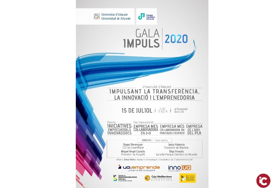 La Universidad de Alicante celebra el próximo miércoles 15 de julio, a las 12 horas en el Paraninfo, la Gala Impulso 2020 donde se darán a conocer los ganadores de la última convocatoria de los Premios Impulso a iniciativas empresariales innovadoras. Este año la Gala se verá condicionada por la excepcionalidad de la crisis derivada del Covid-19, por lo que tendrá un aforo máximo para garantizar las medidas de seguridad e higiene previstas por las autoridades sanitarias y guardando las distancias de seguridad.