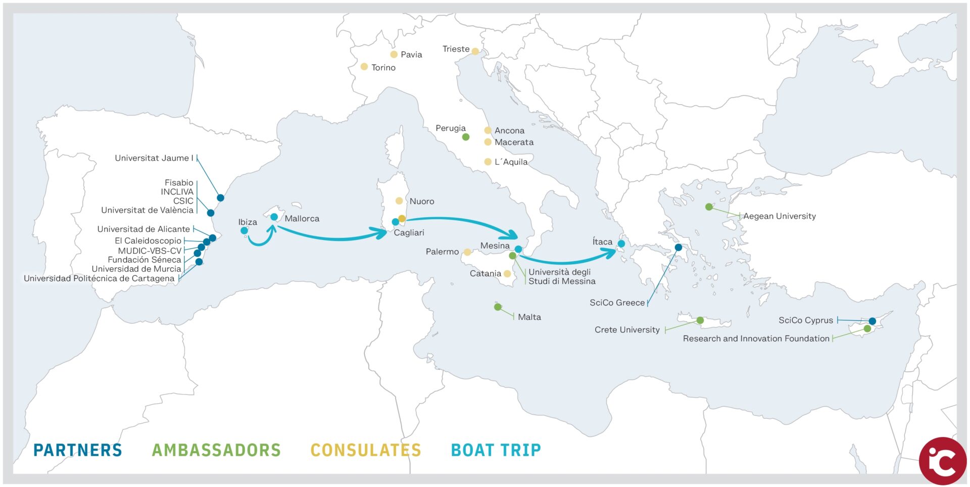 Este mapa señala las ciudades de la cuenca mediterránea en las que se realizarán actividades en la Noche Mediterránea de las Investigadoras, además de la ruta que realizará una de las embarcaciones abanderada de la MEDNIGHT 2021, desde Alicante a Ítaca.
