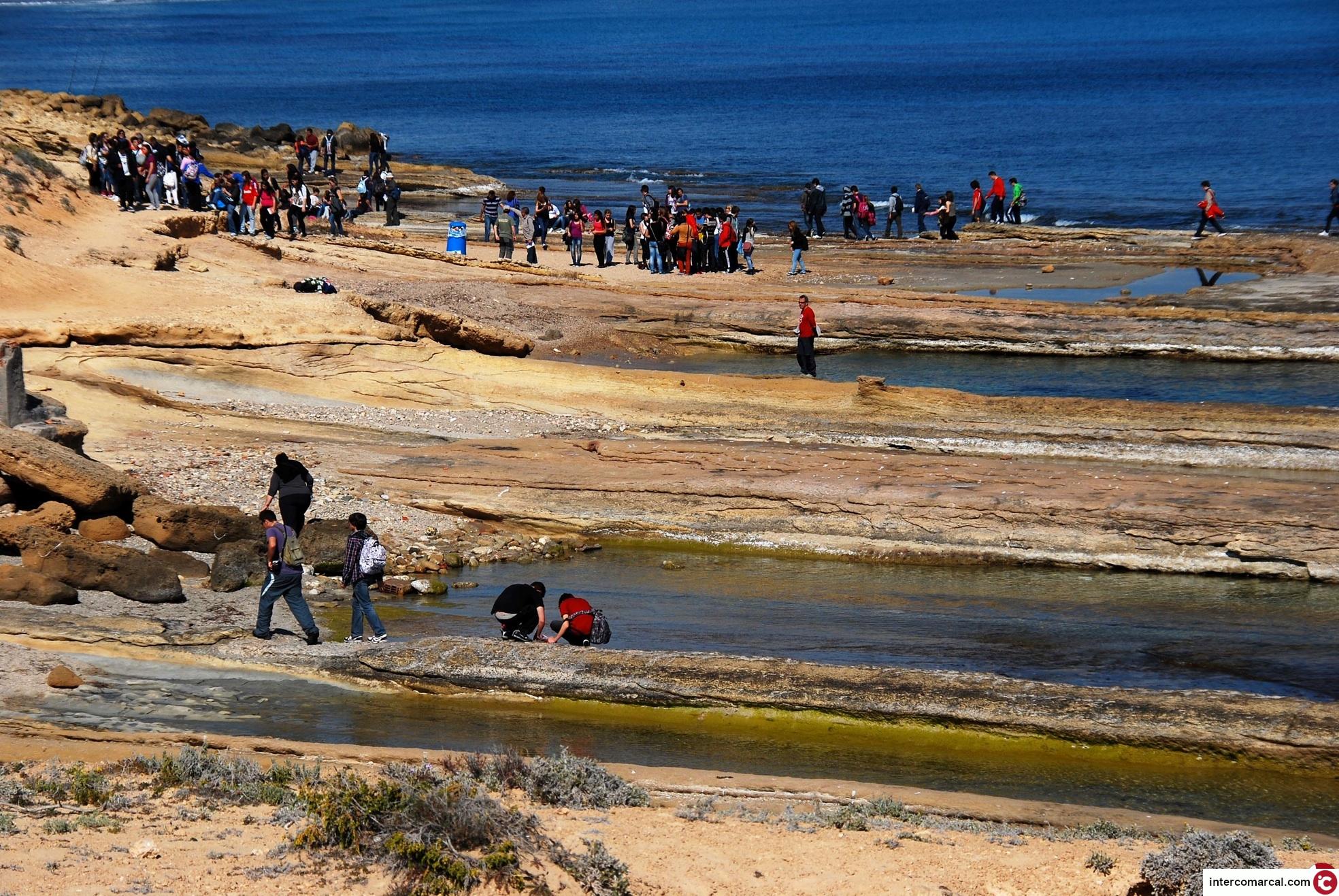 Durante el recorrido, los alumnos realizan observaciones con lupa de granos de arena. discerniendo los casos en que se trate de organismos o conocen de sus monitores el tiempo en que se formaron diversas rocas (en el Cabo de las Huertas, entre 8 y 10 millones de años en unos casos y 100.000 años en otros). También estudian los estratos del Mioceno, se familiarizan con su superposición y comprueban la discontinuidad del registro geológico. Buscan fósiles y han de intentar identificarlos, y conocen las razones del aspecto dentado de la costa de la zona y las fracturas de sus rocas, entre otros detalles geológicos.