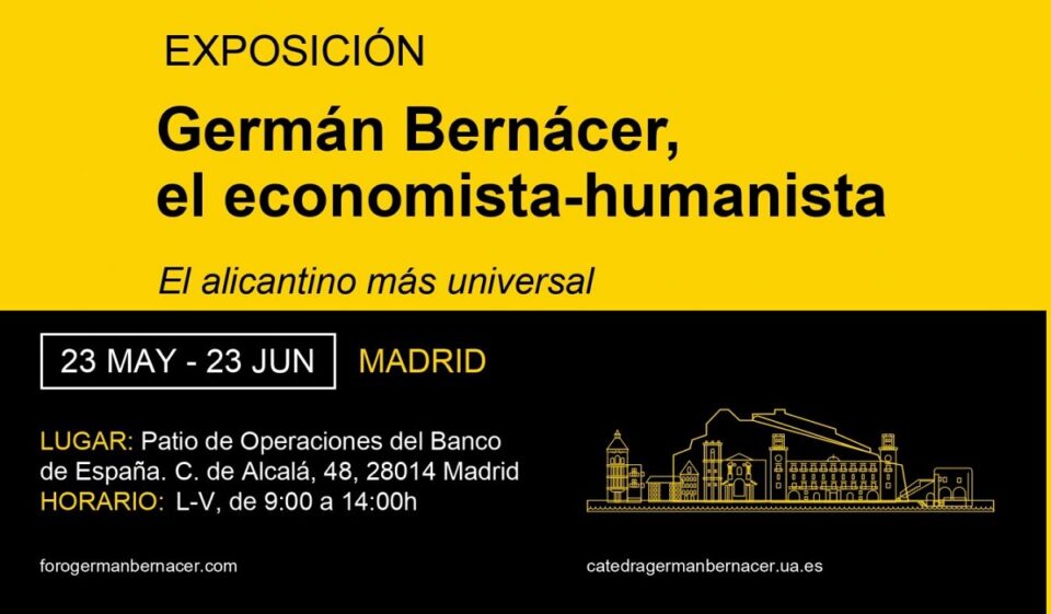 La rectora de la Universidad de Alicante, Amparo Navarro, el gobernador del Banco de España, Pablo Hernández de Cos, y el presidente del Foro de Debate Económico Germán Bernácer, Pedro Algarra, inauguran el próximo día 23 de mayo en el Patio de Operaciones del Banco de España, en Madrid, la exposición “Germán Bernácer, el economista-humanista más universal”. La muestra, que fue inaugurada hace un año en el paraninfo de la Universidad de Alicante, llega a Madrid tras un periplo por la provincia de Alicante con el mismo objetivo de reivindicar para la ciudadanía a una de las figuras más relevantes del siglo XX. Con su filosofía de conectar los temas económicos con la problemática de la sociedad y sus entornos más cercanos, la exposición se complementará con la celebración, por la tarde, de una mesa redonda de análisis.