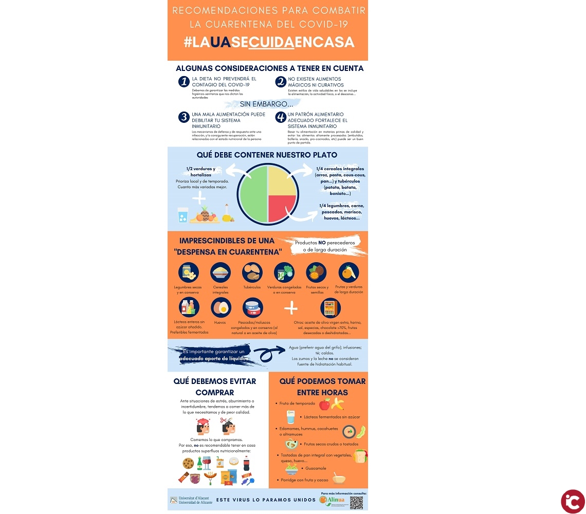 La Universitat d’Alacant ha elaborat una sèrie de recomanacions dieteticonutricionals per a aquests dies de confinament orientades tant a la població general com als principals grups de risc indicats pel Ministeri de Sanitat. El Gabinet d’Alimentació i Nutrició (ALINUA), amb el suport del Vicerectorat de Responsabilitat Social, Inclusió i Igualtat, faciliten informació veraç sobre alimentació saludable.