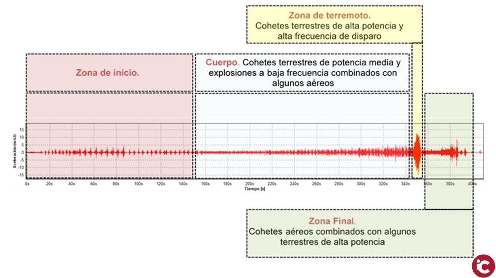 Els resultats conclouen que sobserva lexistència de quatre fases al llarg de la duració de la mascletda: una fase inicial caracteritzada per la voladura de focs aeris; el cos o fase principal de la mascletada, en què se succeeix una majoria de detonacions a baixa freqüència al nivell de terra i combinades amb alguns focs aeris; una tercera fase, amb gran concentració de focs a altura mitjana (rang groc en la figura 5), que provoca un impacte fort en molt poc de temps. Aquest és lanomenat terratrèmol. I la fase final, que combina focs aeris amb algunes explosions a terra de fort impacte.