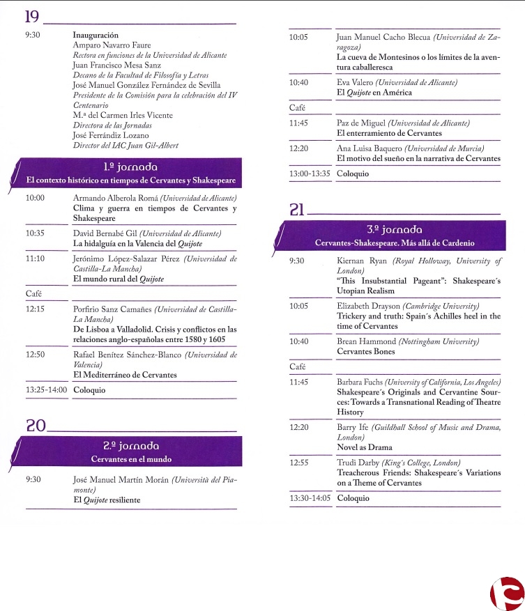 Les jornades representen la part científica de l´àmplia programació dirigida a aquest doble centenari, programació que s´estén al llarg de tot l´any, com ha assenyalat José María Ferri Coll, vicedegà d´Ordenació Acadèmica i Postgrau de la Facultat de Filosofia i Lletres de la UA. El punt en comú de tots els ponents, als quals separa la diversitat dels seus coneixements, és que cadascun dels participants tinga publicada una obra de referència sobre aquest tema, ha declarat Ferri. Una altra de les premisses per a l´organització de les jornades ha sigut buscar l´equilibri en els continguts. Entre ells està la participació d´una de les arqueòlogues que ha treballat en la recerca i troballa de les restes de Cervantes al convent de les Trinitàries Descalces de Madrid, Paz de Miguel, tema sobre el qual centrarà la seua intervenció. Els especialistes sobre Shakespeare, tots ells de primera fila, procedeixen de diverses universitats de Londres, de Cambridge, Nottingham i Califòrnia.