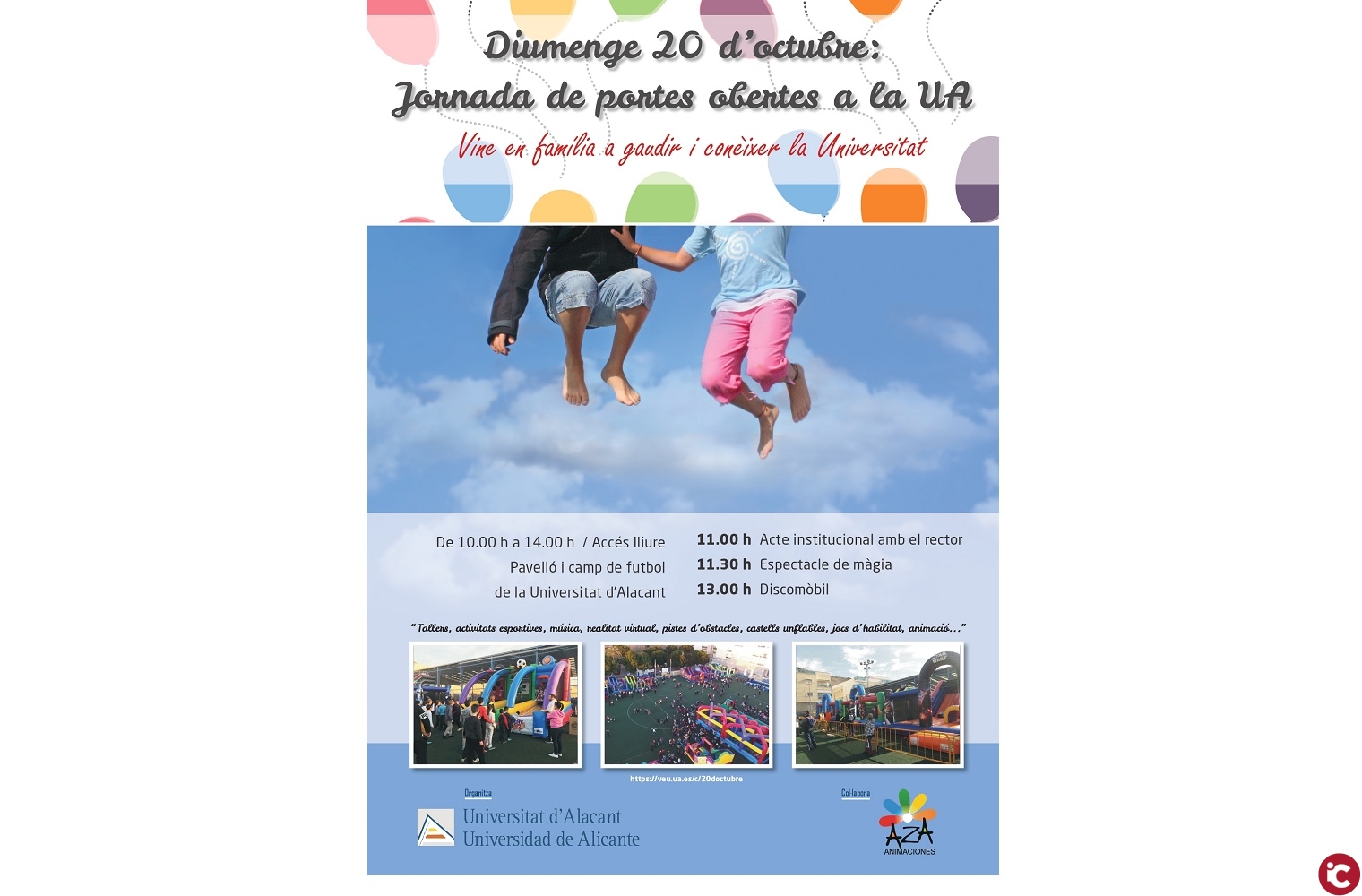La UA celebra aquest esdeveniment per primera vegada, en una jornada matinal de 10 a 14 hores, en les instal·lacions esportives de la universitat, amb un programa integrat per tallers i activitats orientades principalment al públic familiar: jocs dhabilitat, animació, música, espectacle de màgia i activitats esportives. Al recinte hi haurà també estands informatius dels serveis de Cultura, Llengües, Esport, Consell dEstudiants, Servei dInformació i Centre Superior dIdiomes.