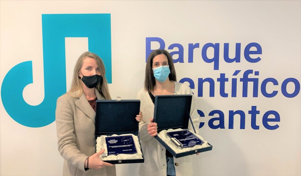 Peu de foto: Olga Francés gerent del PCA i Iluminada Rodríguez, CEO d’Applynano en els premis de la rePCV 2020.