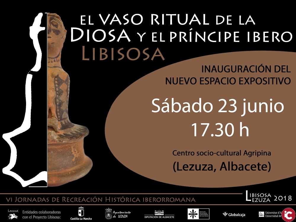 La Colección Museográfica de Lezuza (Albacete), instalada en el Centro socio-cultural Agripina de Lezuza, inaugura, el sábado 23 de junio de 2018, a las 17:30 horas, el nuevo espacio expositivo “El vaso ritual de la diosa y el príncipe ibero”. Este espacio está dedicado a uno de los objetos más excepcionales que ha deparado el yacimiento de Libisosa, en el que la Universidad de Alicante ha venido colaborando los últimos 20 años; se trata de un vaso cerámico ibero con cuerpo de diosa, de funciones rituales, hallado en un lugar de culto del siglo II a.C. recientemente descubierto en el marco de las excavaciones dirigidas por Héctor Uroz (Universidad de Murcia) y José Uroz Sáez (UA). La pieza sirvió, como era habitual en el arte ibérico, como propaganda política, mostrando uno de los primeros episodios del príncipe, del antepasado mítico de la aristocracia que gobernaba el oppidum de Libisosa, en el que se evidencia su relación privilegiada con la divinidad.
