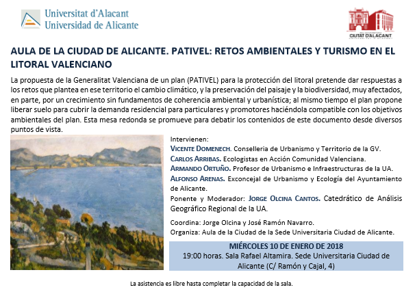 El debat serà moderat pel mateix Olcina, que també intervindrà com a ponent al costat de Vicente Doménech, (Conselleria d’Urbanisme i Territori de la Generalitat Valenciana); Carlos Arribas (Ecologistes en Acció Comunitat Valenciana); Armando Ortuño, professor d’Urbanisme i Infraestructures de la UA, i Alfonso Arenas, exregidor d’Urbanisme i Ecologia de l’Ajuntament d’Alacant.