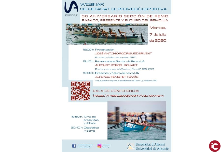 El Secretariat dEsports de la Universitat dAlacant ha organitzat un webinar el pròxim dimarts 7 de juliol a partir de les 19 hores amb motiu del 30 aniversari de la secció de rem de la UA.