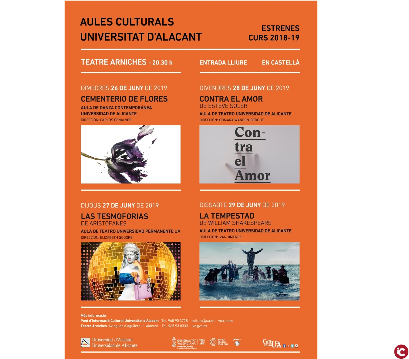Avui dimecres 26 de juny començaran les actuacions amb l’espectacle de dansa Cementerio de flores, a càrrec de l’Aula de Dansa de la UA dirigida per Carlos Peñalver, qui descriu aquesta proposta com «un espai per a arribar cap a una realitat etèria, on l’oníric s’apodera dels cossos que s’alliberen fins a marcir. Al final només queda l’etern, l’ànima». El dijous 27 de juny serà el torn de Las Tesmoforias , interpretada per l’Aula de Teatre de la UPUA, una versió actualitzada d’una comèdia grega d’Aristòfanes representada durant les festes Dionisies en el 411 a. de C. Parodiant algunes de les obres d’Eurípides, l’obra se centra en el poder que les dones arriben a tenir quan s’uneixen per una causa comuna. Enguany, l’elenc de l’Aula de Teatre de la UPUA està format per dotze actrius i quatre actors, i Elisabeth Sogorb, la directora, ha partit del treball coral com a base del procés de creació. L’Aula de Teatre de la UA posarà sobre l’escenari l’obra Contra el amor del dramaturg català Esteve Soler, el divendres 28, dirigida per Xiomara Wander-Berghe, Què és l’amor? Com ens relacionem sentimentalment? L’amor trau el millor i el pitjor de nosaltres mateixos. A través de set obres burlesques aquesta proposta ens fa reflexionar sobre la deformació de l’amor en la nostra societat actual. La possessió, el sacrifici, l’anhel, l’amor romàntic entre altres formes doloroses d’estimar es presenta en forma d’humor negre en aquesta obra magistral de Soler. Deu actors i actrius amateurs encarnen aquests fantàstics personatges que travessen els límits de la fantasia i el temps. Es donen la mà realisme i surrealisme per a fer-nos veure d’una vegada com de nocius podem arribar a ser. Finalitzarà el programa el dissabte 29 de juny amb l’obra La Tempestad, de William Shakespeare, també a càrrec de l’Aula de Teatre de la UA. L’elenc, amb el seu director Iván Jiménez al capdavant, proposa la recreació d’un «conte» meravellós, ple de màgia. La Tempestad és l’última obra que va escriure William Shakespeare. Els personatges, més de catorze, viuran un experiència màgica en una petita illa que els canviarà la vida per sempre. La proposta de l’Aula de Teatre clàssic de la UA, transita entre la comèdia i el drama, la llum i la foscor. En aquest muntatge no hi ha bons ni dolents. És una radiografia de l’ànima dels personatges de Shakespeare, però amb un neó rosa. La subtilesa i la bogeria es donen la mà durant l’espectacle.