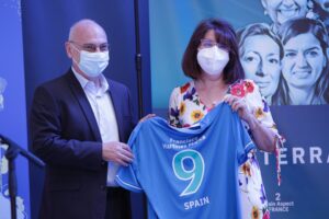 L’investigador de la UA, que en els últims anys ha entrat en les travesses dels Premis Nobel per la nova tècnica d’edició genètica CRISPR, va rebre una samarreta de futbol amb l’escut de MEDNIGHT, que simbolitza la pertinença a un equip pioner en la lliga de la ciència, de la mà de la rectora de la UA Amparo Navarro.