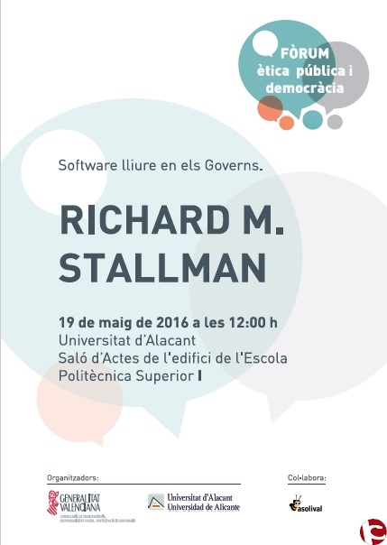 Abierto a toda persona interesada por conocer las ventajas políticas, sociales y tecnológicas del uso del software libre entre las administraciones públicas valencianas y los profesionales de informática, Richard Stallman imparte, mañana jueves 19 de mayo de 2016, a las 12:00 horas en el Paraninfo de la Universidad de Alicante, la charla «Gobierno abierto y software libre: hacía un nuevo modelo de administración».
