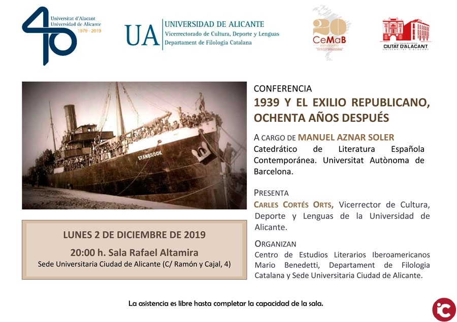 Manuel Aznar Soler, catedràtic de Literatura Espanyola Contemporània de la Universitat Autònoma de Barcelona i expert en la literatura durant la II República, la Guerra Civil i l’exili republicà de 1939, impartirà el dilluns 2 de desembre a les 20 hores la conferència «1939 y el exilio republicano, ochenta años después» en la sala Rafael Altamira de la Seu ciutat d’Alacant (Ramón y Cajal, 4). Carles Cortés, vicerector de Cultura, Esport i Llengües de la Universitat d’Alacant, presentarà el convidat en un acte coorganitzat pel CeMaB, el Departament de Filologia Catalana i la Seu.