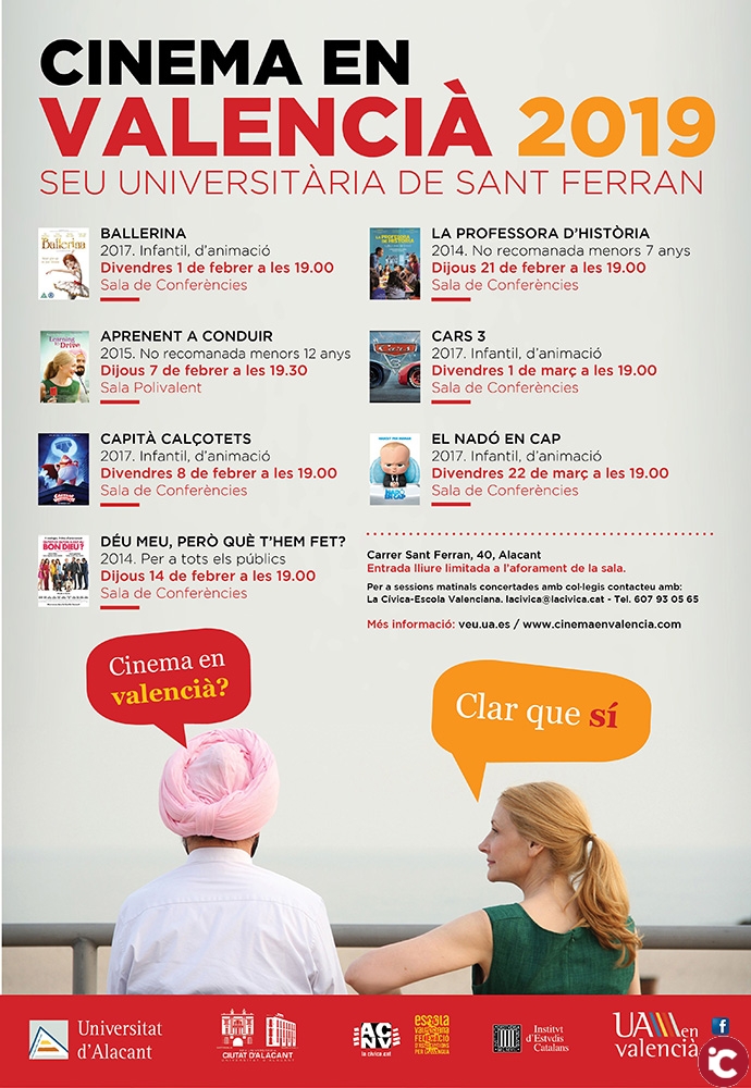 Aquest tradicional cicle de Cinema en Valencià s’organitza gràcies a la col·laboració del Servei de Llengües de la Universitat d’Alacant, la mateixa Seu Universitària Ciutat d’Alacant, La Cívica. Escola Valenciana, l’Institut d’Estudis Catalans i el projecte UA en Valencià.
