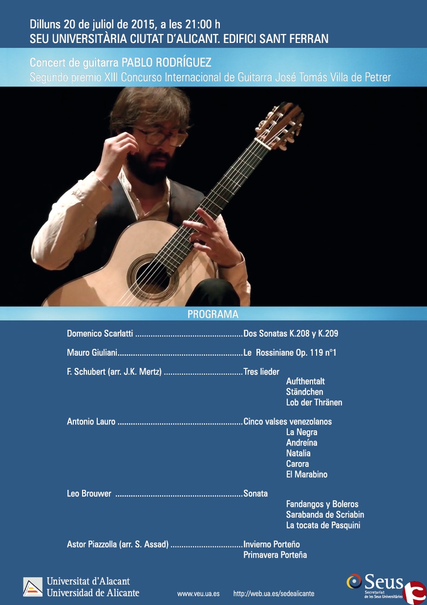 17 de julio de 2015.- El próximo lunes día 20 de julio, a las 21 horas, el guitarrista coruñés Pablo Rodríguez será el protagonista del concierto de guitarra clásica que tendrá lugar en la Sede Universitaria Ciudad de Alicante (c/San Fernando, 40).