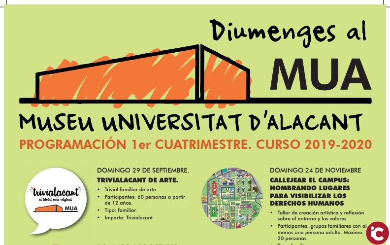 El Museu de la Universitat dAlacant (MUA) torna a posar en marxa el programa «Diumenges al MUA» amb set propostes per al primer quadrimestre del curs, del diumenge 29 de setembre al diumenge 15 de desembre: Trivial dart, llibremància, creació de feres salvatges, ciutats imaginàries, art i drets humans, joc descapada i un taller historicoartístic. Totes les activitats són gratuïtes i és necessari fer una inscripció prèvia. Les inscripcions sobrin a les 8 hores del dilluns previ a la data de cada taller en http://www.mua.ua.es/inscripciones/. Les activitats es faran d11 a 12.30 hores.