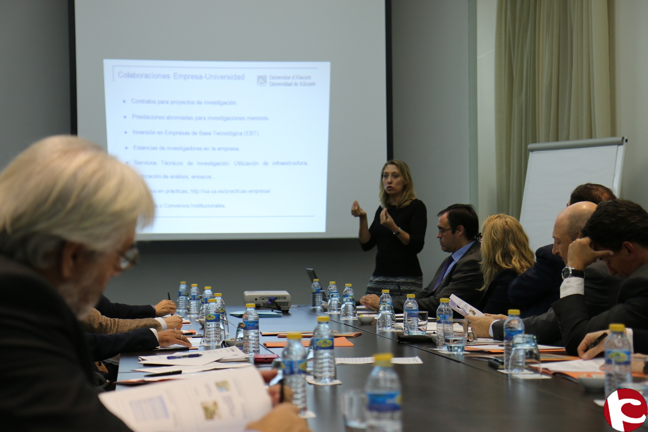 La directora del Secretariado de Transferencia del Conocimiento, María Jesús Pastor, ha sido la encargada de presentar a la directiva de la FOPA, con su presidente, Javier Verdú, a la cabeza, el proyecto InnoUA.