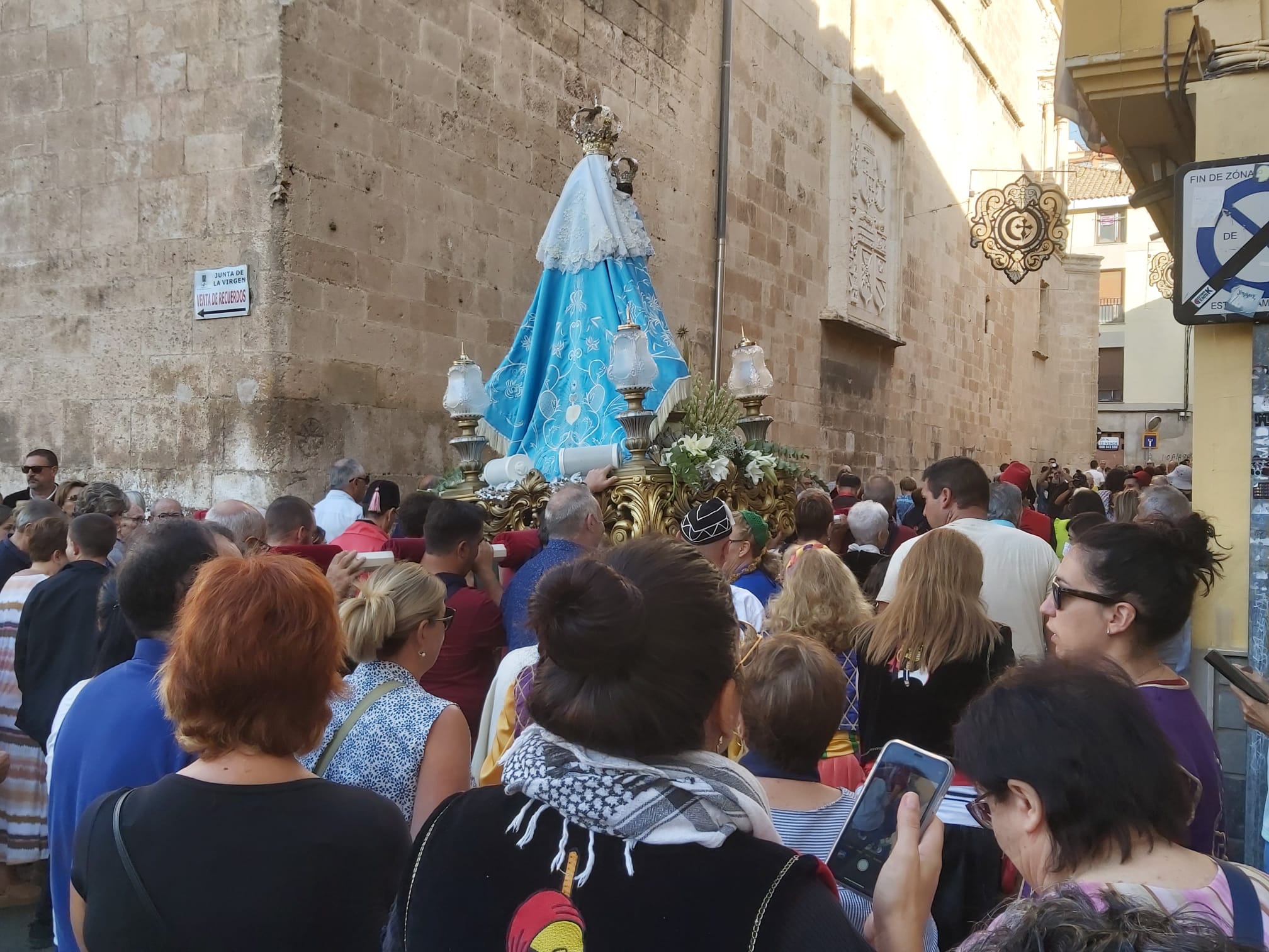 Unos pocos minutos después de las 9:00 horas, la Sagrada Imagen ha salido en Romería por la puerta lateral de la Iglesia Arcedianal de Santiago Apóstol acompañada por Clero, Autoridades y Pueblo en general, recorriendo las calles: Capitán López Tarruella, Corredera, Luciano López Ferrer, Cánovas del Castillo, Cristóbal Amorós, Gil Osorio, para finalizar en el paso a nivel de la carretera de Yecla, donde La Morenica ha sido despedida a los acordes del Himno Nacional. Mientras, las comparsas han efectuado disparos de arcabucería y han rodado sus banderas. Finalizada la despedida, la Banda Municipal de Música de Villena, ha acompañado al clero y autoridades hasta la Plaza de Santiago mientras las comparsas se reintegran a sus sedes.