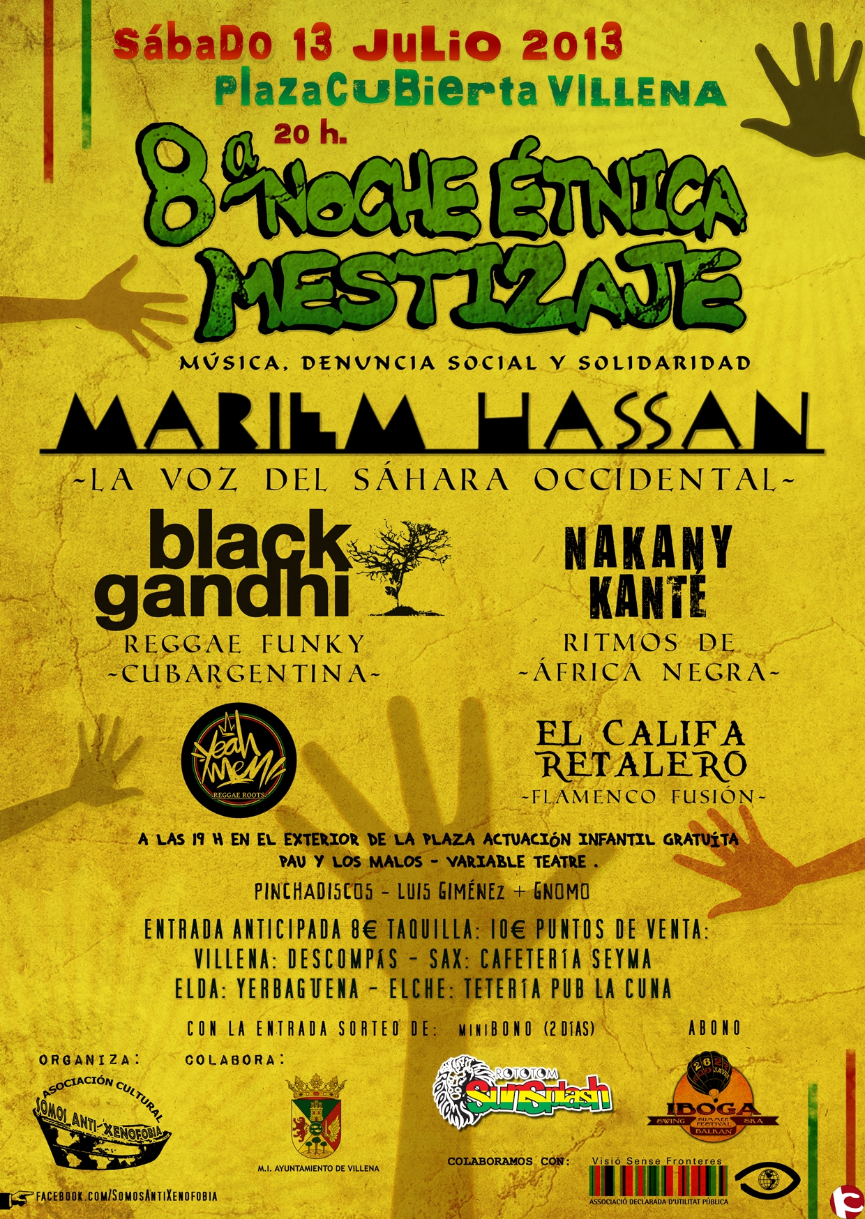 Llega de nuevo a Villena por segundo año consecutivo este gran evento socio-musical organizado por la Asociación Cultural Somos Anti Xenofobia que este año llega a su octava edición, algo ya prácticamente inédito para un festival de la provincia.Con el principal objetivo principal de romper una lanza a favor del mestizaje humano, a través de los sonidos del mestizaje musical. Músicos de distintos lugares del mundo unidos en esta gran mani-fiesta-acción que no te debes perder!