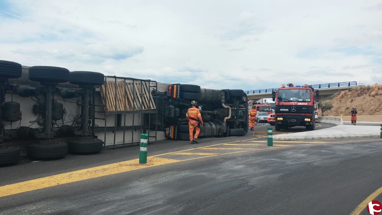 Sobre las 15:35 de la tarde de ayer domingo 14 de junio. Se producía el vuelco de un camión en la carretera de Fuente la Higuera, dentro del término municipal de esta vecina localidad valenciana pero muy cerca del límite provincial con Alicante, las llamadas al 112 informaban de que en el interior de la canina se encontraba atrapado el conductor del vehículo y que debido al fuerte impacto el depósito de gas-oíl estaba roto y se estaba produciendo una fuga de combustible a la vía. De inmediato el 112 movilizaba a bomberos de la provincia de Alicante y Valencia. Acudiendo hasta el lugar del accidente dotaciones de bomberos de Villena, Játiva y Onteniente. Los bomberos una vez en el lugar rescataban al chofer del interior de la cabina que sufría heridas diversas, a la vez, taponaban y controlaban la fuga de gas-oíl. El herido fue atendido en el lugar por los medios sanitarios y la guardia civil de tráfico, regulaba el tráfico en la zona hasta la retirada del camión siniestrado de la vía.