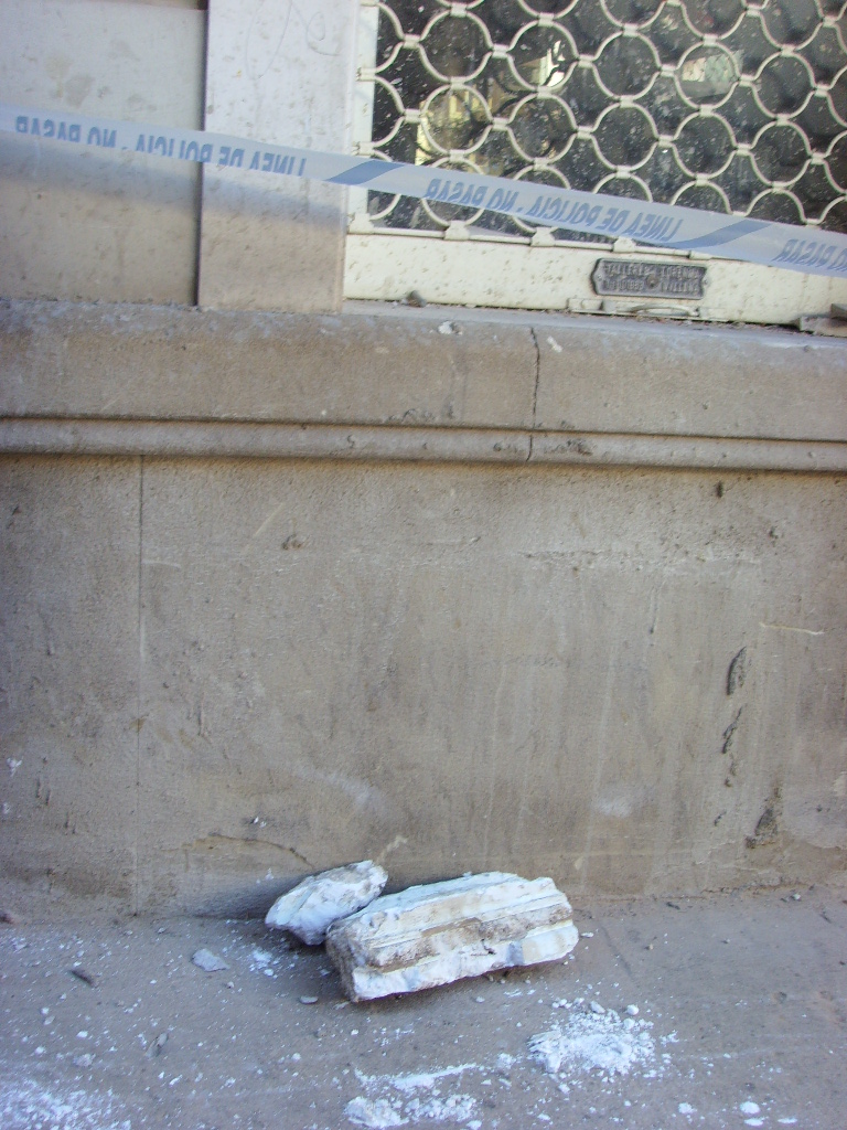 Varios vecinos de la zona, alertaban de la caída de piedras de gran volumen y del peligro que había especialmente para los transeúntes. Cabe recordar que el edificio está in operativo una vez que la empresa que efectuaba las obras efectuó suspensión de pagos. La pregunta que se hacían esta mañana varias personas “cual será el futuro del edificio y si las viviendas tienen propietarios”.