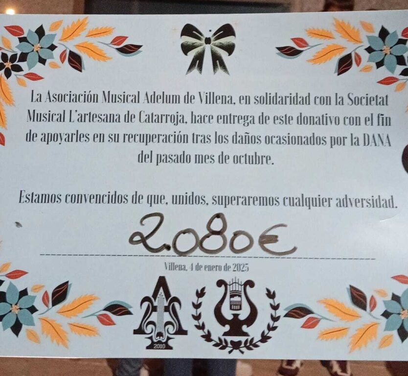 Durante la velada, los músicos de Adelum ofrecieron un repertorio variado que no solo celebró la riqueza cultural de las bandas de música, sino que también transmitió un fuerte mensaje de apoyo y unidad. La jornada además incluyó una rifa de productos donados por empresas locales, lo que permitió sumar un total de 2.080 euros que serán destinados íntegramente a la recuperación de la histórica banda de Catarroja.