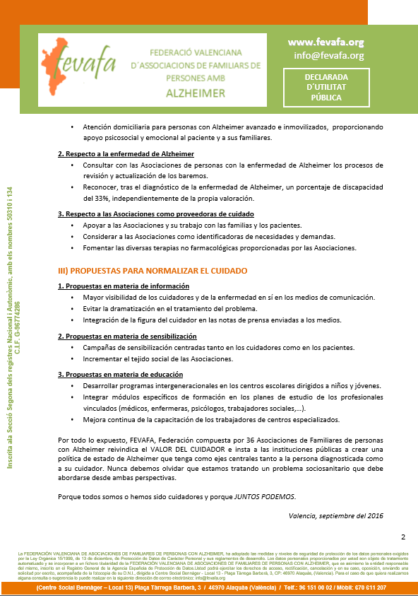 La Asociación XXX, perteneciente a la Federación de Alzheimer de la Comunitat Valenciana (FEVAFA), reivindica el valor del cuidador en el Día Mundial del Alzheimer. Además, insta a las instituciones públicas a crear una política de Estado del Alzheimer que tenga como ejes centrales tanto a la persona diagnosticada como a su cuidador, ya que nunca se debe olvidar que se trata de un problema sociosanitario que debe abordarse desde ambas perspectivas.