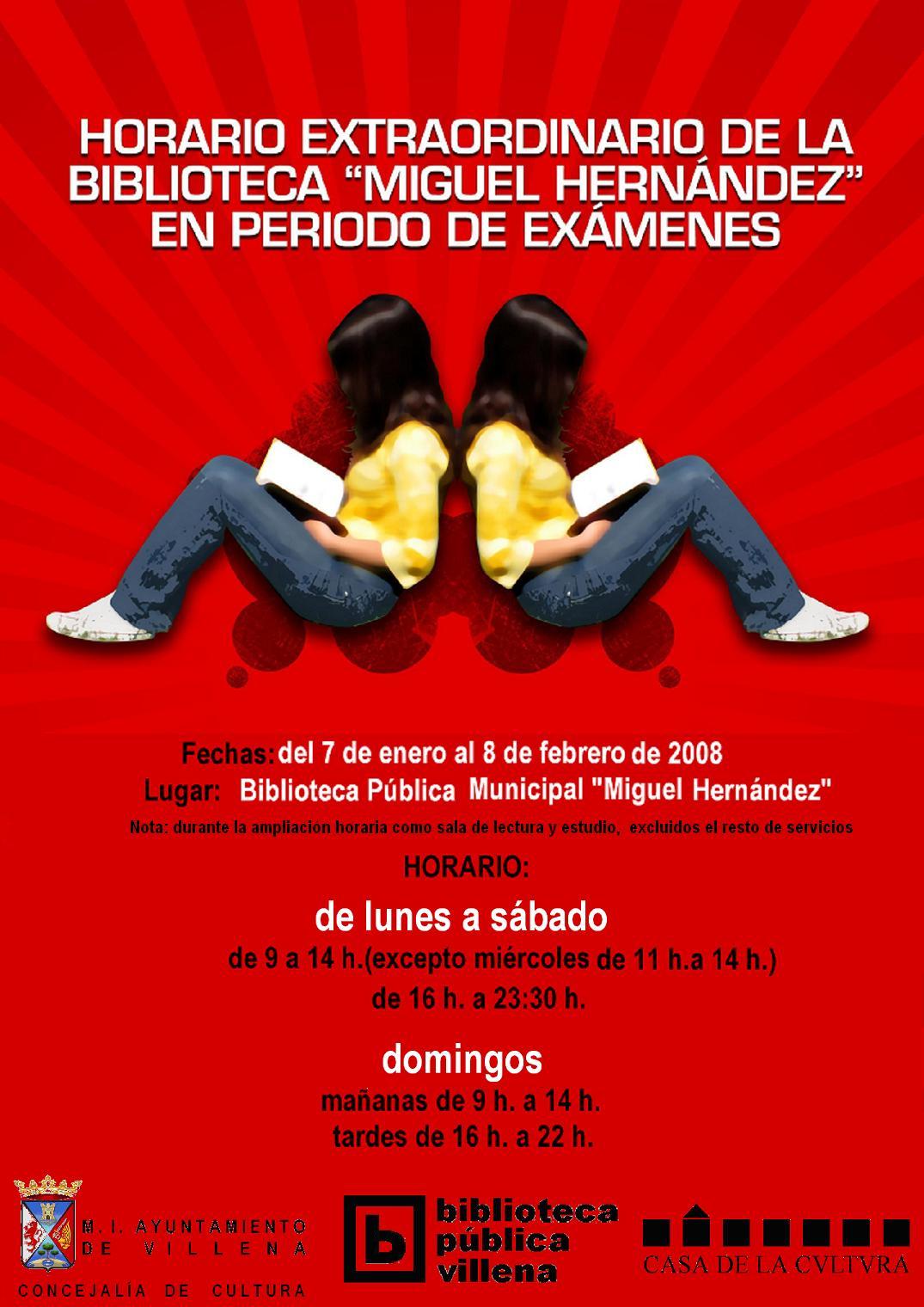 Como en años anteriores, la biblioteca “Miguel Hernández” amplía su horario de apertura por el periodo de exámenes de los estudiantes universitarios. El horario de apertura extraordinaria está previsto en los siguientes periodos: