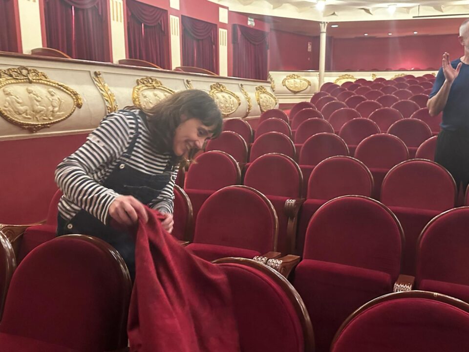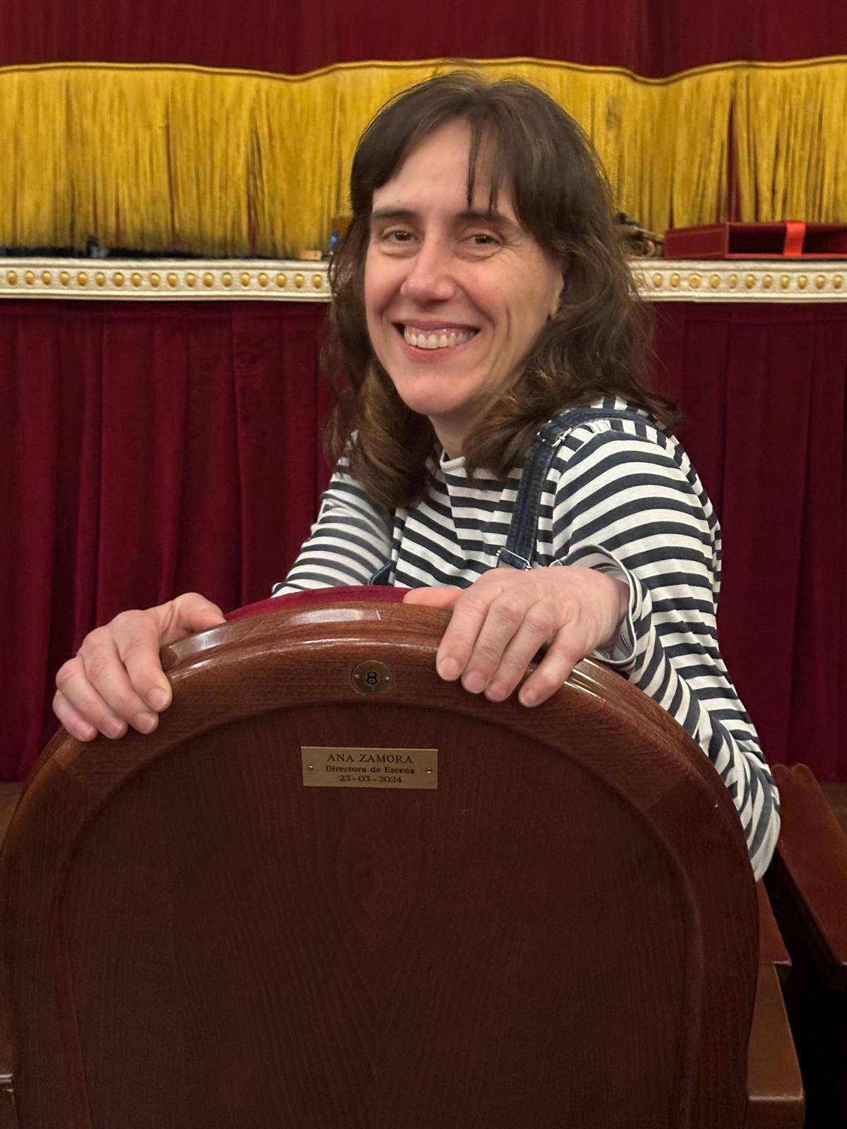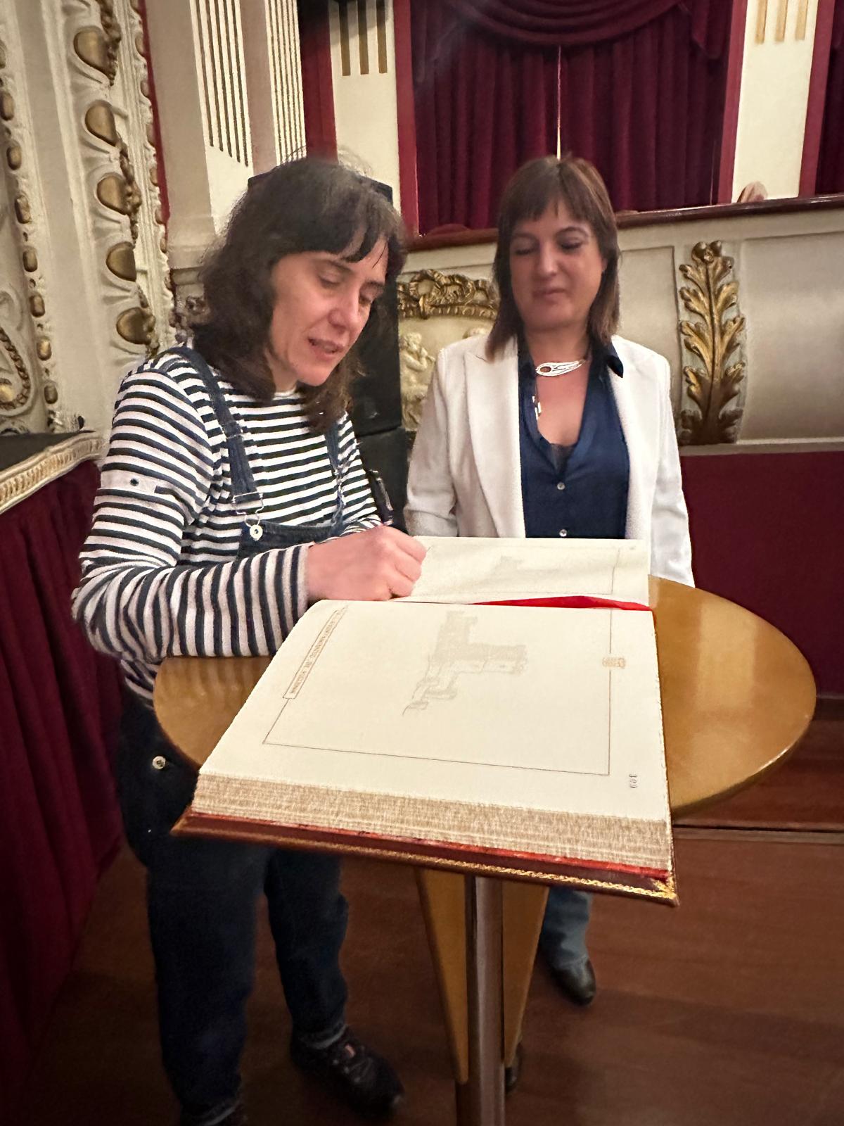 Villena, 24 de marzo.- La directora teatral Ana Zamora, premio Nacional de Teatro 2023, ha dejado para siempre su nombre grabado en el respaldo de una de las butacas del Teatro Chapí de Villena tras la representación de la obra, ante un lleno completo, ‘Misterio del Cristo de los Gascones’, estrenada en 2007 y que atesora importantes premios y reconocimientos en todo el mundo. Zamora, acompañada por la edil de Cultura, María Server, destapó la placa con su nombre y firmó en el Libro de Honor del Ayuntamiento.