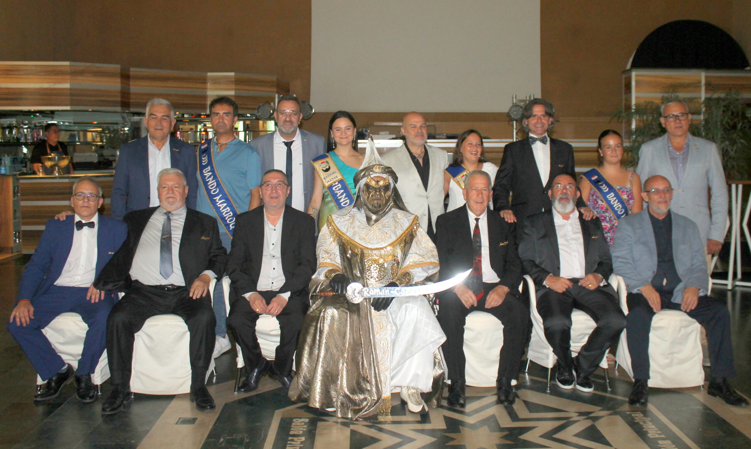 Ocasión especial fue el Coctel de bienvenida, cena y gran presentación del Traje Almorávide el 3 de agosto de 2024 en el Salón Principal de Villena. Asistieron todos los miembros de la escuadra y parejas, hijos, invitados, Cargos Marroquíes 2024 y presidenta Bando Marroquí (sobre 70 personas). Tras la cena y cuando Pedro “el Toto” se enfundó el Traje Almorávide 2024 para iniciar su presentación, José Milán Ibáñez le hizo entrega de una gumía muy especial al estar su hoja grabada con dos nombres de almorávides tristemente desaparecidos: “Román*Carajillo”. El señor Milán y en la cena de navidad, oyó decir a Pedro que le gustaría tener una gumía así labrada… y el día de la presentación del traje se la regaló al haberla fabricado sin que nadie supiera nada. Su inmenso detalle y trabajo fue aplaudido por todos los presentes; la emoción… indescriptible. A los sones de la marcha mora, Pedro “el Toto” realizó un desfile luciendo el nuevo atuendo almorávide.