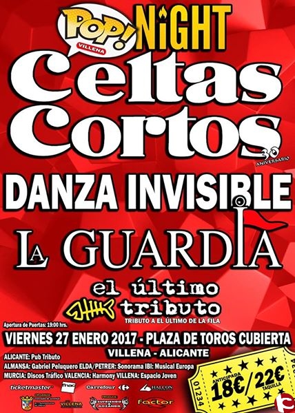 Villena Pop Night se celebrará el viernes 27 de enero de 2017, en la Plaza de Toros Cubierta de Villena. Contará con la presencia de Celtas Cortos, de rabiosa actualidad no ya solo por su gira conmemorativa de sus 30 años sobre los escenarios, sino también por la reciente edición de «In Crescendo», álbum en directo con al Orquesta Sinfónica del Principado de Asturias, La Guardia, Danza Invisible o el mejor tributo de El Último de la Fila, llegado desde Barcelona.