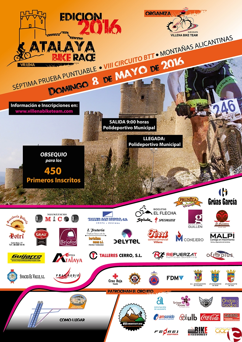 El próximo domingo 8 de mayo el Polideportivo Municipal de Villena acogerá la VII edición de Atalaya Bike Race. La salida será a las 9 horas desde el Polideportivo Municipal con un recorrido de 52 kilómetros y la participación de más de 400 deportistas.