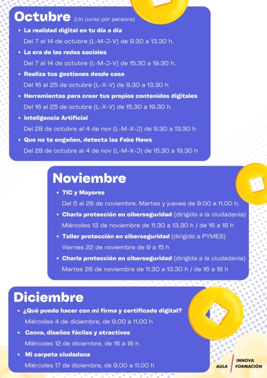 En noviembre, la oferta se completa con los cursos ‘TIC y mayores’, ‘Charla INCIBE protección en ciberseguridad dirigido a la ciudadanía’, que se desarrollará en dos turnos de mañana y tarde el 13 y el 26 de noviembre, así como una tercera edición para las PYMES.