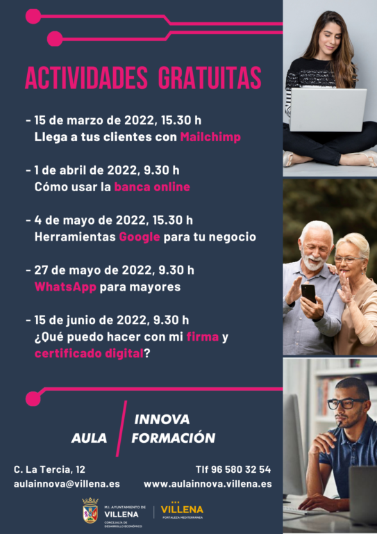 Los cursos se desarrollan en una única jornada que permite disponer de una idea general del funcionamiento de cada una de las herramientas. El primero de ellos está previsto para el próximo 15 de marzo, de 15.30 a 17.30 horas sobre la cuestión de “Llega a tus clientes con Mailchimp”. El 1 de abril, de 9.30 a 11.30 horas se abordará las claves básicas sobre “Cómo usar la banca online”. El 4 de mayo, en esta ocasión de 15.30 a 17.30 horas, se abordará las “Herramientas Google para tu negocio”. El 27 de mayo, se ha programado el curso “WhatsApp para mayores”. El último curso del semestre tendrá lugar el 15 de junio sobre “¿Qué puedo hacer con mi firma y certificado digital?”.