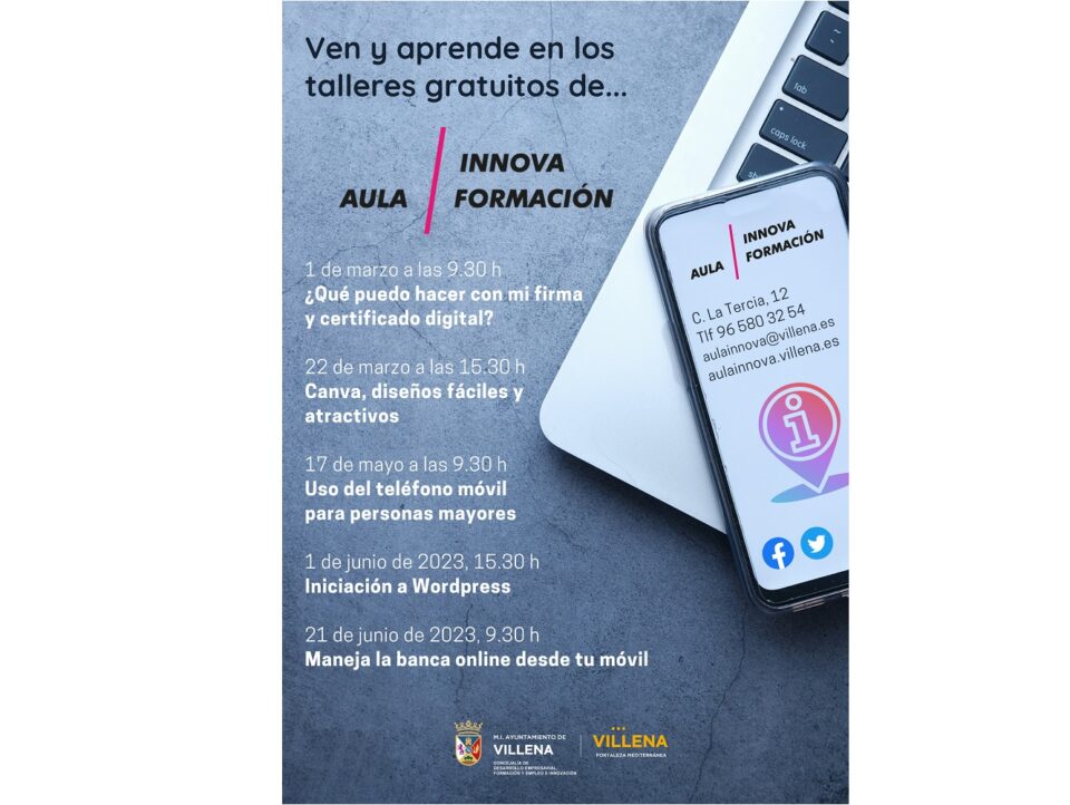 Villena, 21 de febrero.- El Ayuntamiento de Villena, a través de Aula Innova Formación, ha presentado la nueva programación de talleres gratuitos que comenzarán a principios de marzo y se prolongarán hasta el inicio del verano en la nueva campaña para ofrecer capacitaciones digitales a la ciudadanía y reducir la brecha digital entre la población con mayores dificultades.