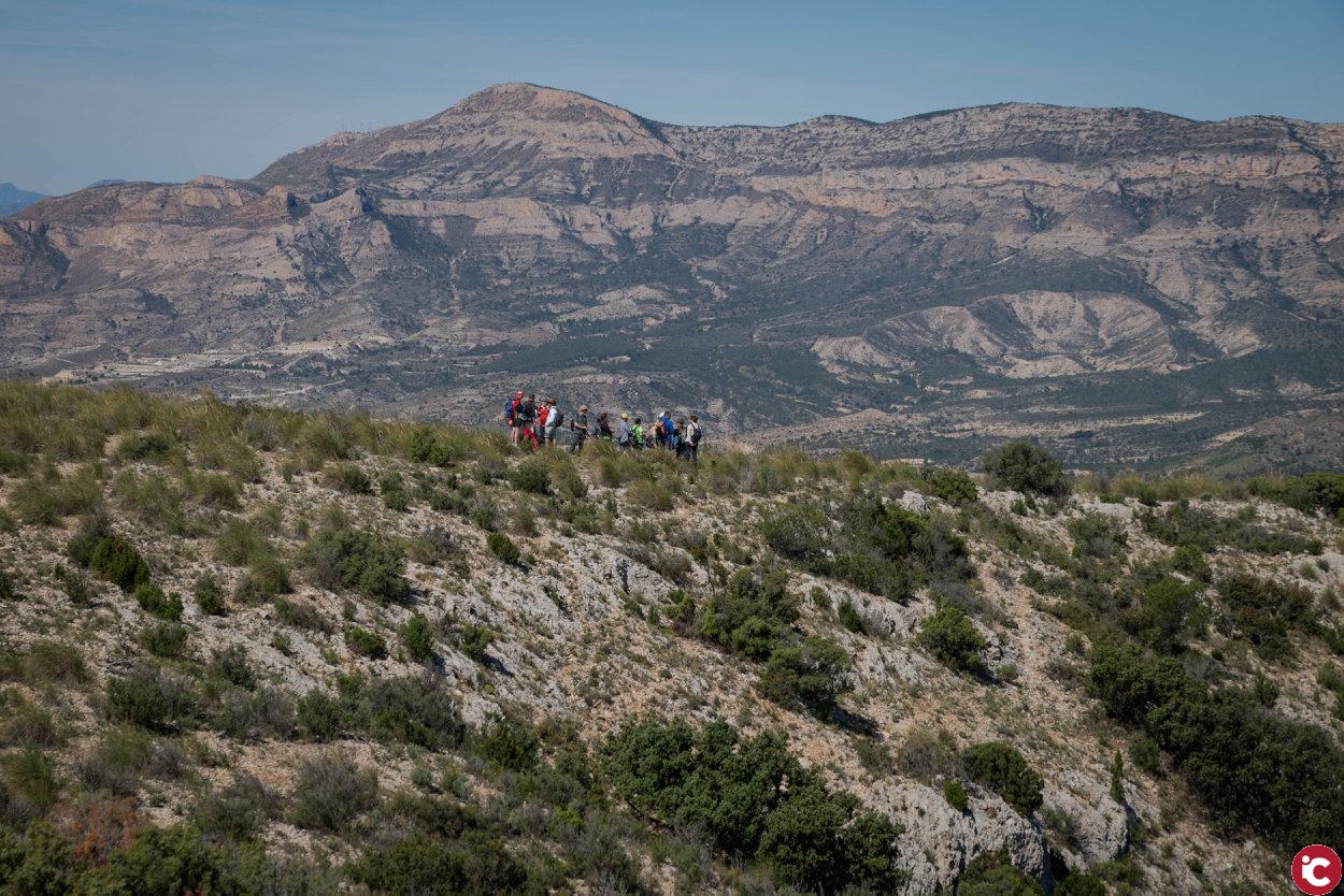 Comenzamos la ruta siguiendo el PR-CV269 con una subida bastante potente pero que nos va ofreciendo unas vistas impresionantes, a la derecha Elda, Monforte del Cid, Agost, la costa de Alicante, a la izquierda podemos ver el Maigmó, el Castellar, Las lomas de la Beata y Tibi. Un regalo para la vista, como también lo es para el olfato por el olor que desprende su vegetación, romero, rabo de gato, cantueso y tomillo.