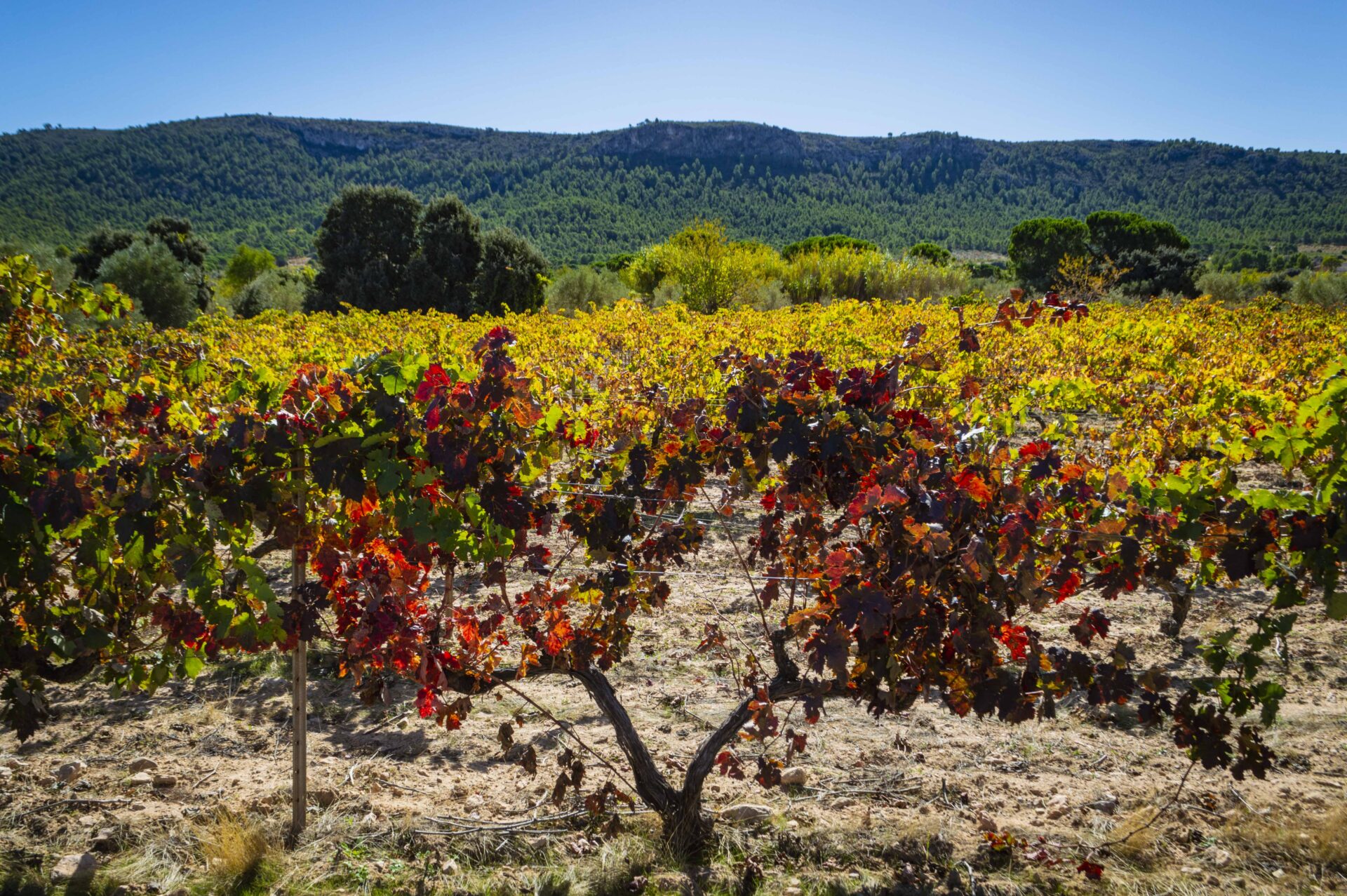 La ruta se llevó a cabo por la Sierra de la Solana, pasando por el Barranco del infierno, El Cordel de Cabreras y la Vereda de la Zafra en un monte con pinos, carrascas, alguna sabina, almendros y viñas. Estas últimas pintando de rojo sus hojas en este principio de otoño pero con un sol y temperatura propias de un día de verano. En muchos tramos abundaba el esparto y nos deleitaba el aroma de las plantas aromáticas, como el romero y el tomillo. En la parada para el almuerzo disfrutamos de una vista espectacular del valle de los Alhorines , desde un punto en el que confluyen los términos de Villena, Cañada, Fontanares y Campo de Mirra.