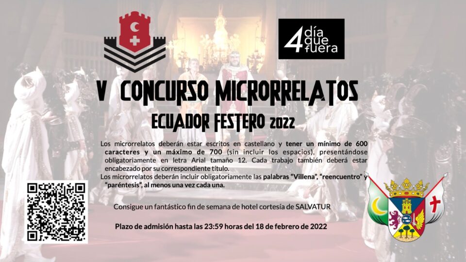 La Junta Central de Fiestas de Moros y Cristianos de Villena convoca, con motivo de la celebración del Ecuador Festero 2022, el V Concurso de microrrelatos “Ecuador Festero 2022”.