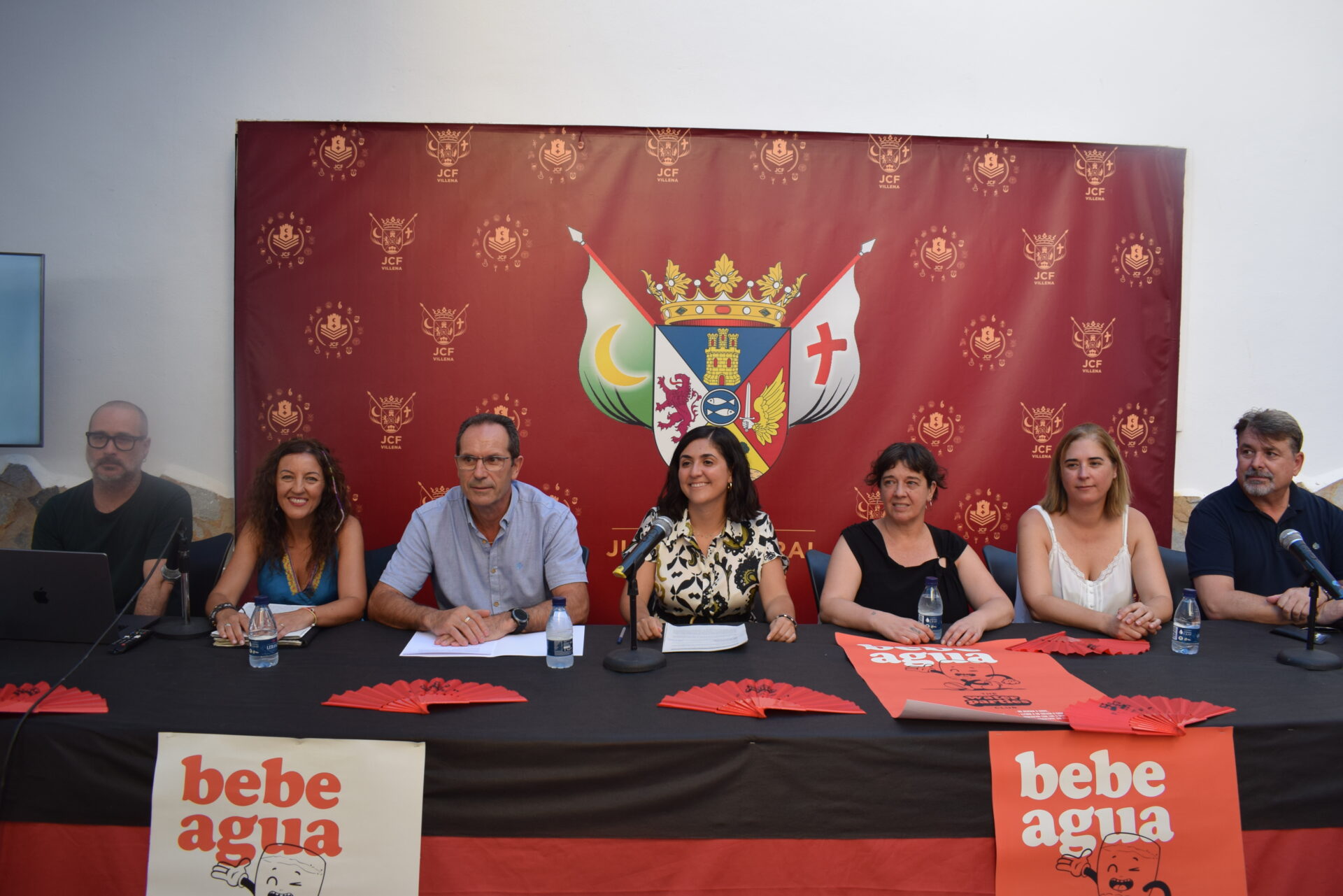 Villena, 22 de agosto de 2023.- La concejala de Bienestar Social e Igualdad, Alba Laserna y el edil de Fiestas, Pepe Ferri, presentaron ayer junto a representantes de diferentes entidades sociales y festeras ‘The water parties club’, marca y campaña para la prevención y concienciación ante el abuso de alcohol y otras sustancias y tolerancia cero ante agresiones y abusos para las próximas fiestas de Moros y Cristianos.