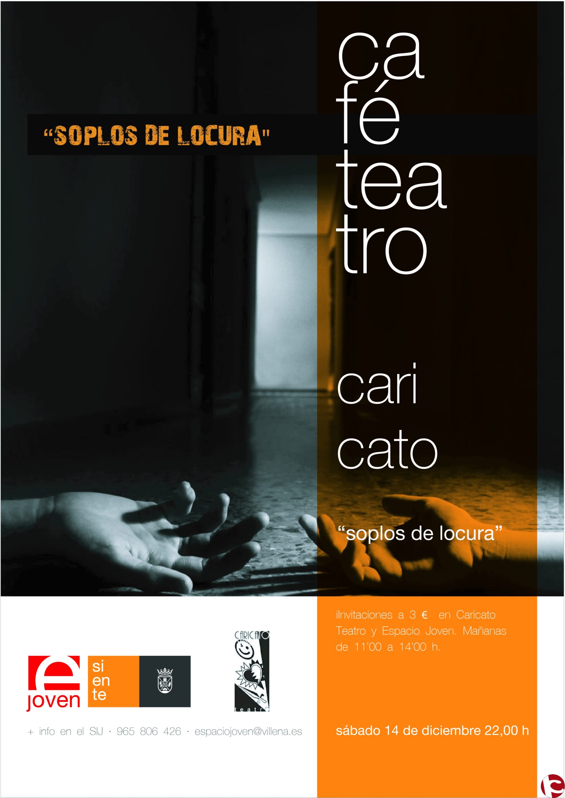 CARICATO TEATRO presenta un café-Teatro de exención, todo el grupo al completo participa de esta locura. 18 personajes darán vida a “SOPLOS DE LOCURA”, así se titula este café-teatro que no dejará indiferente a nadie del público.