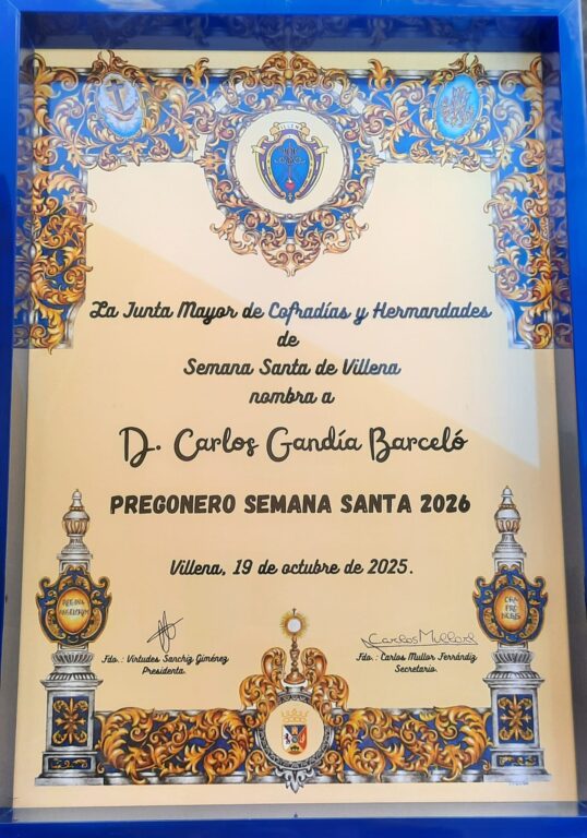 En un emotivo acto celebrado recientemente, la Junta Mayor de Cofradías y Hermandades ha anunciado el nombramiento de D. Carlos Gandía Barceló como Pregonero de la Semana Santa 2026.
