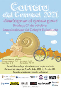 La Asociación de Jugadores Rehabilitados Nueva Vida, junto con la colaboración del M.I. Ayuntamiento de Villena, Villena en Bici, Villena Cuéntame, Cosas de Villena que se han perdido o no existen y el Club Ciclista del Alto Vinalopó organizan la VI Carrera del Caracol en Villena, el próximo domingo 24 de octubre de 2021.