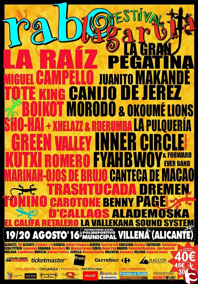 Villena se convierte en la capital de la música cada agosto, primero por la celebración de su consolidado Festival ‘Leyendas del rock’ que cumple 11 años en 2016; y en segundo lugar por el Festival ‘Rabolagartija’, que se estrenó el año pasado obteniendo un gran éxito, lo que le han llevado a organizar una segunda edición ampliando los días de conciertos. El 19 y 20 de agosto grandes grupos y solistas del panorama musical local y nacional cantarán en directo ante miles de fans deseosos de escuchar la mejor música. Bandas como Boikot, La Raíz, La Gran Pegatina y Trashtucada formarán este gran cartel, que completarán cantantes como RdeRumba, ‘El Bicho’, Tote King o Morodo, entre otros. Para su disfrute, la ciudad habilitará dos grandes escenarios, así como piscina, dos campings y zonas de sombra. Una vez más, Villena se convierte en el lugar al que trasladarse en verano.