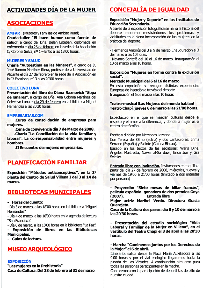 El Ayuntamiento de Villena presenta este año un programa de actividades con gran variedad de oferta, exposiciones, charlas, teatro, cine, etc La programación de actividades conmemorativas en torno al Día Internacional de la Mujer se prolongará hasta el mes de abril.