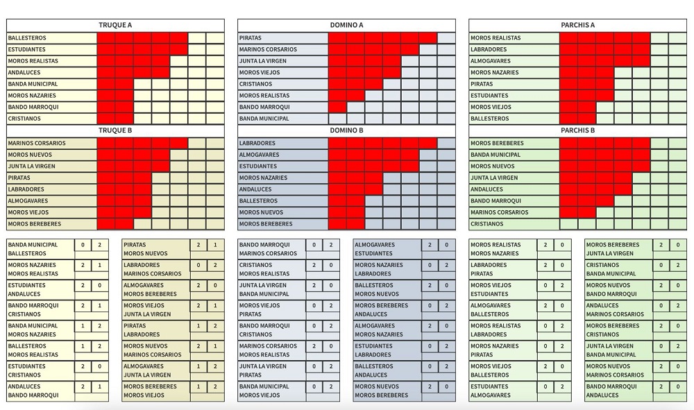 Así quedan las semifinales de los campeonatos de truque, dominó y parchís, que se celebrarán hoy a partir de las 21:30 en la sede de la Comparsa de Andaluces Villena.