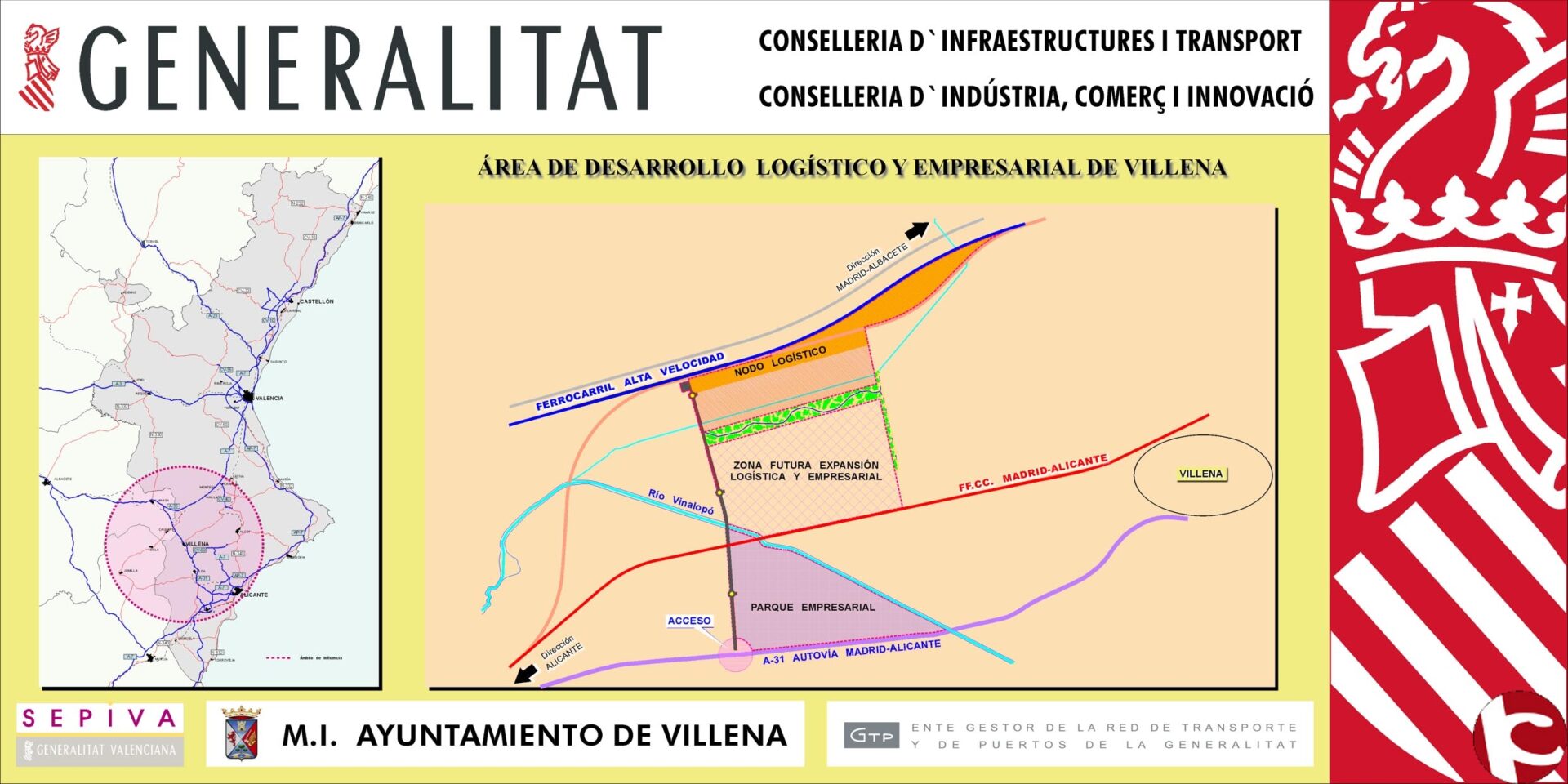 Este proyecto comprende la dotación de dos zonas próximas, una logística y una empresarial, que crearán un gran número de sinergias, y por tanto un ahorro muy importante en los costes de transporte y almacenaje. La nueva área logística y empresarial tendrá una superficie bruta de 1,4 millones de metros cuadrados y superará los dos millones de metros cuadrados en 2020, disponiendo no obstante el Ayuntamiento de Villena de 3 millones de metros. La Generalitat Valenciana con estos dos proyectos estrella pretende dar un nuevo impulso al tejido productivo de la Comunidad Valenciana, y en concreto a la provincia de Alicante y la Comarca del Alto Vinalopó, mediante la ampliación de la oferta de suelo industrial y generando un nodo logístico o centro multimodal de mercancías con una amplia zona de influencia.
