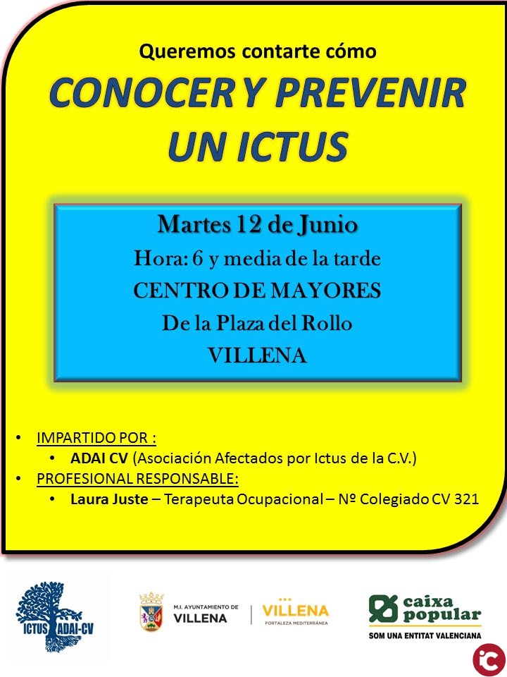 La asociación Ictus Adai de la Comunidad Valenciana organiza junto al Ayuntamiento de Villena una charla para conocer qué es un ictus, cómo actuar en caso de síntomas y sobre todo cómo prevenir que se produzcan. Se trata de un accidente cerebrovascular que se produce cuando la sangre no llega al cerebro debido a la obstrucción o rotura de algún vaso sanguíneo, ha informado el edil de Bienestar Social.