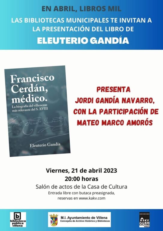 Igualmente, os informamos que el próximo viernes 21 de abril a partir de las 20 horas en la Casa de Cultura de Villena, Bibliotecas Públicas Municipales presentan el Libro de Eleuterio Gandía “Francisco Cerdán, médico”, del que el beneficio de su venta irá destinado al grupo de Parkinson de Amif. En la presentación, además del escritor, Eleuterio Gandía, participaran Jordi Gandía Navarro y Mateo Marco Amorós. Para esta presentación la entrada es gratuita, previa reserva de butaca en www.kaku.com