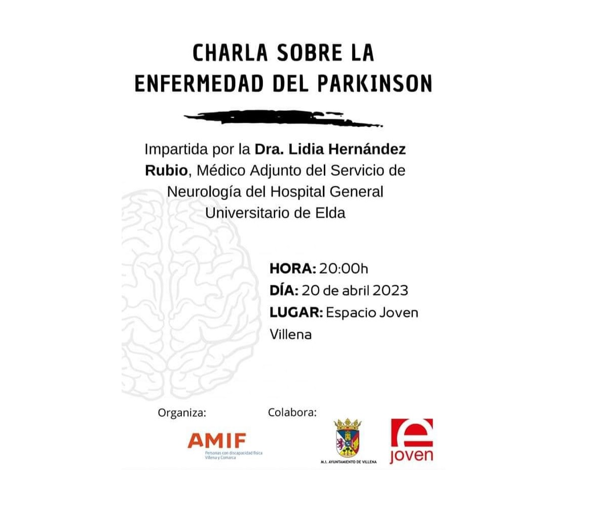 El próximo jueves 20 de abril, a partir de las 20 horas, en el Espacio Joven de Villena, tendrá lugar una charla sobre Parkinson impartida por la Dra. Lidia Hernández Rubio, Médica Adjunta del Servicio de Neurología del Hospital General Universitario de Elda.