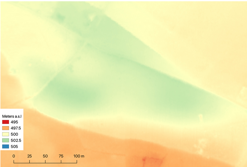 2.- Modelo de elevación digital del terreno en el que se observa la forma de una de las dunas estudiadas (en color verde).